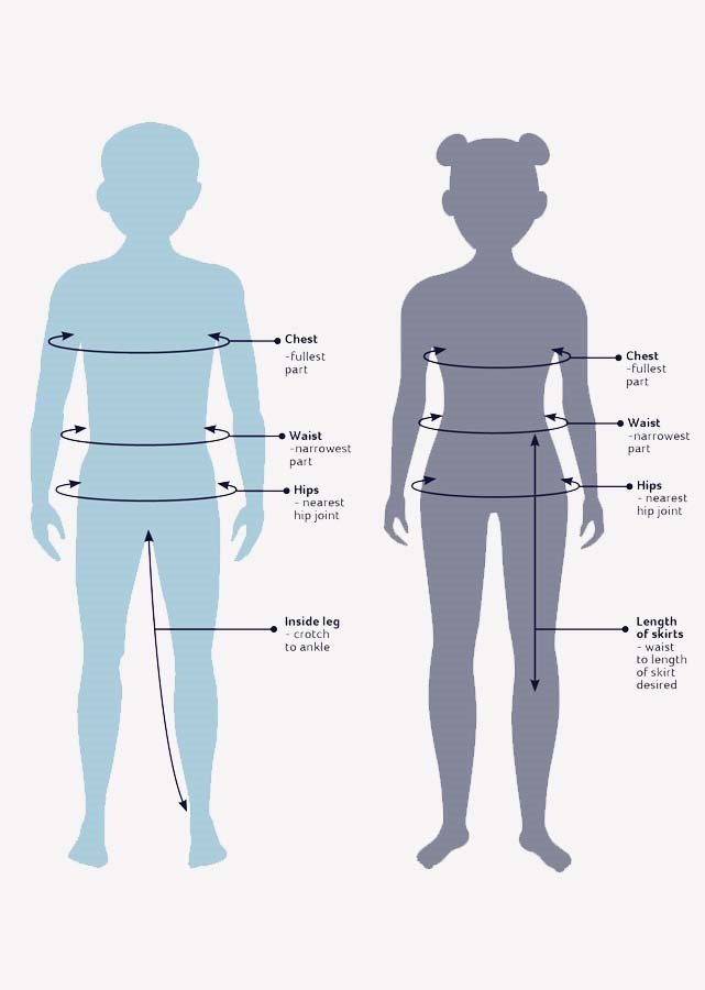 We know that measurements can be confusing, so we have provided clear measurement figures that show you where to measure for different body parts, such as the chest, waist, hips, inside leg, and length of skirts. This information, along with our size guides for each product range, will help you get a better understanding of what size you require. In cases where a garment is measured by body size rather than age, we recommend that you take the time to measure your child correctly to ensure a perfect fit.